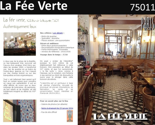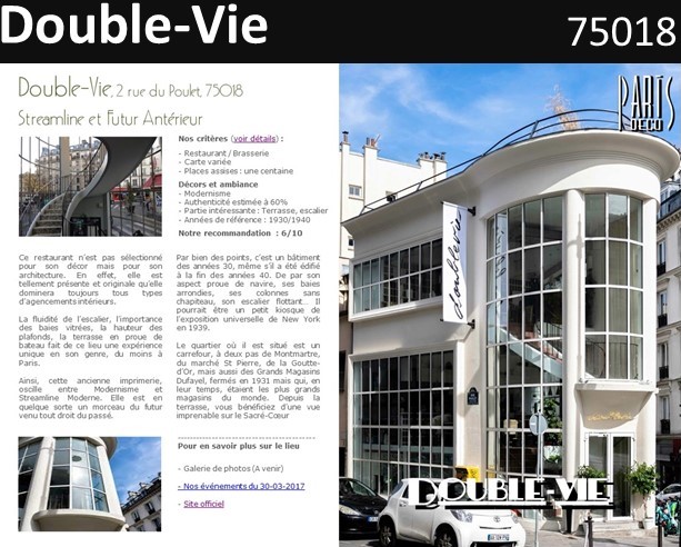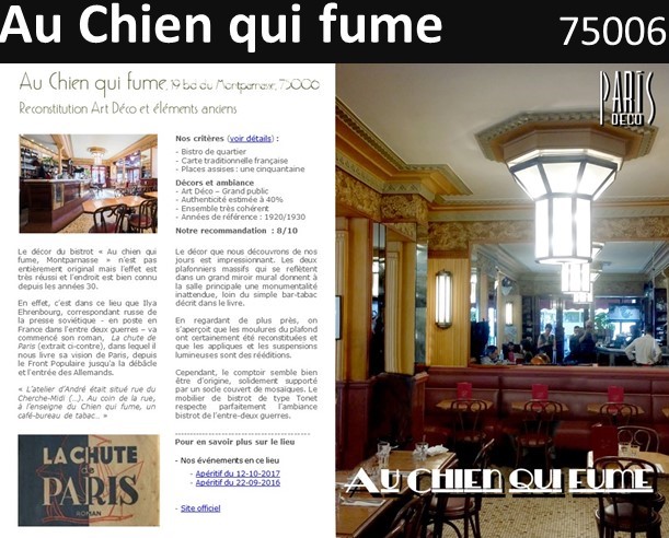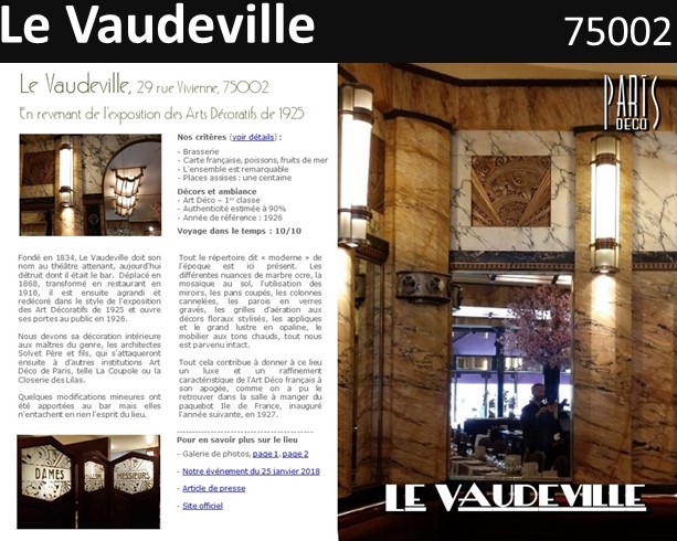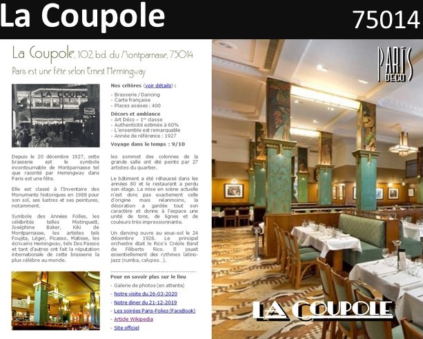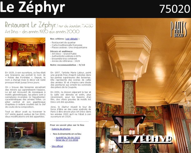 Nous vous indiquons ici les cafés et restaurants où nous avons déjà tenu des événements et dont le décors garde une authenticité Art Déco ou conserve encore un caractère de l’entre-deux-guerres. Pour plus d’information sur nos critères de sélection, cliquez-ici